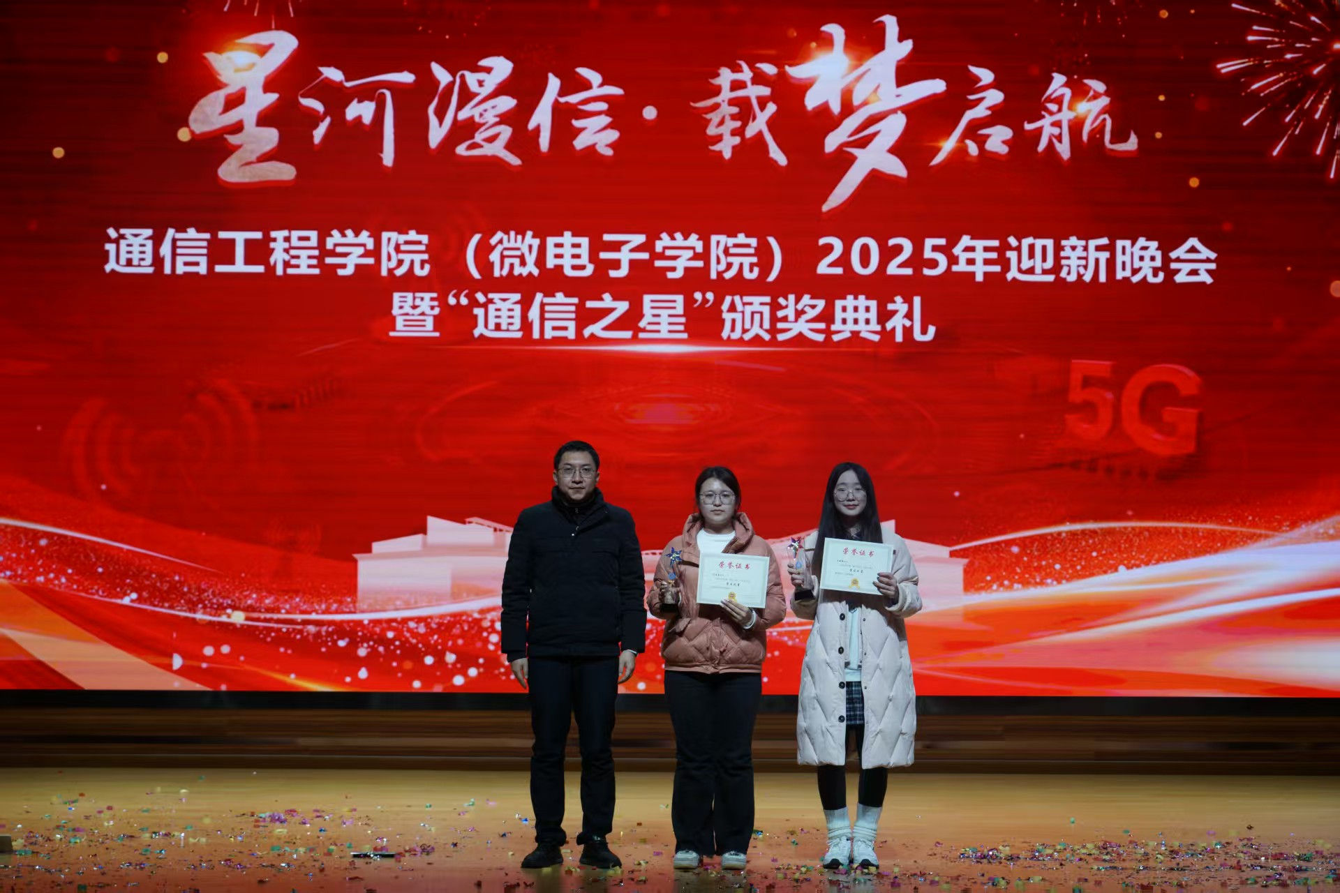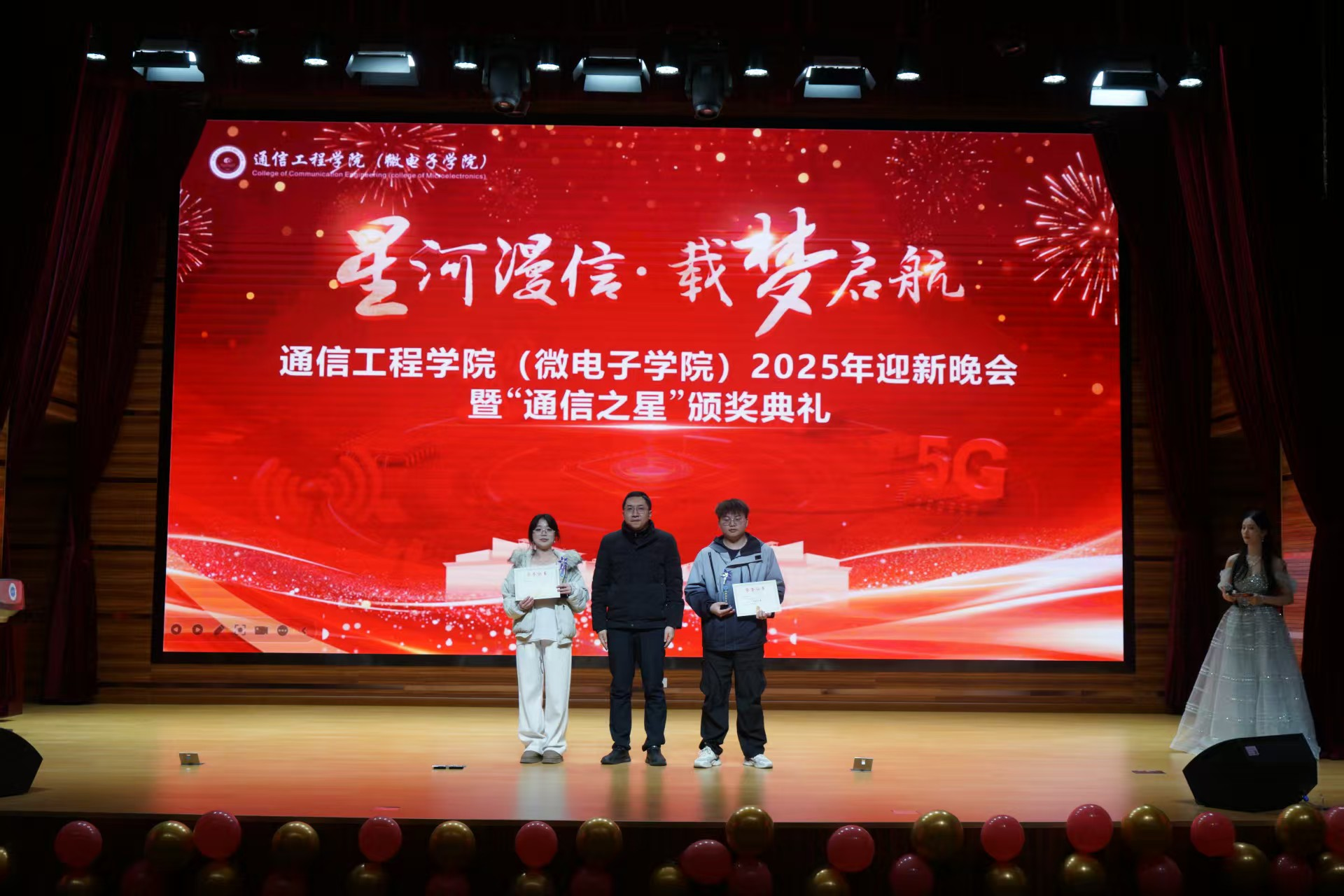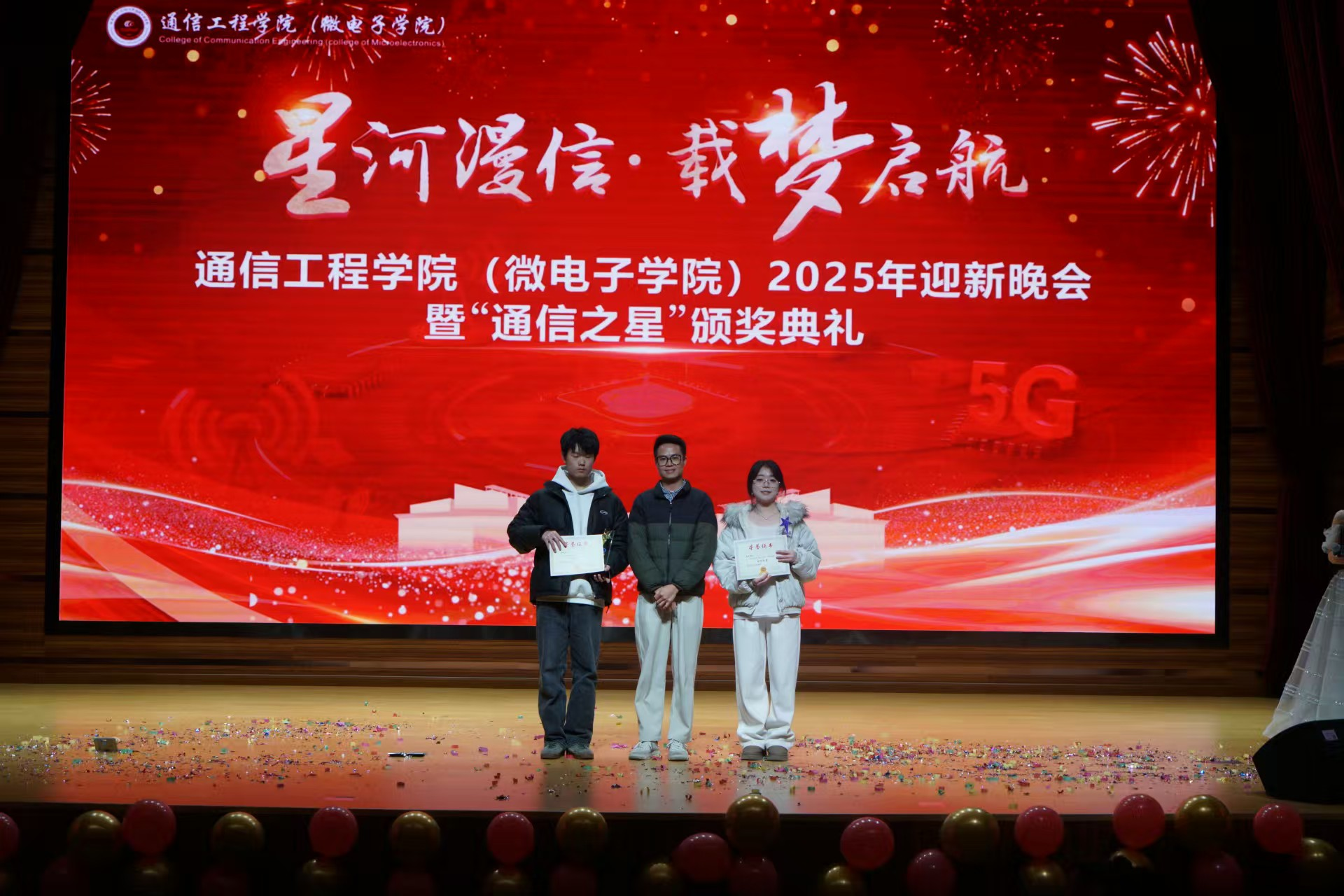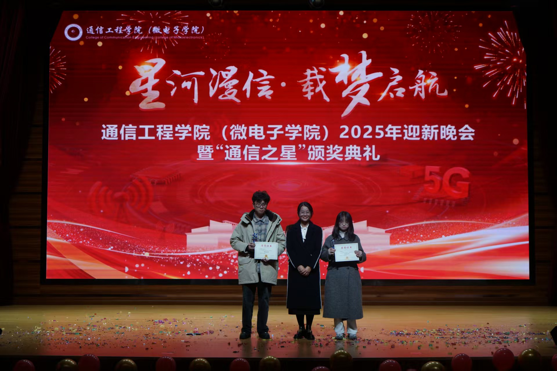 星光引路,信梦起航。12月7日,tyc8722太阳集团城2025年迎新晚会暨“通信之星”颁奖典礼于成信礼堂举行。学院副院长李文藻,校团委青年发展服务中心主任贾思程,学院学生科科长邵璐、团委书记盛小芳、新生辅导员熊渠,团委学生会、青年志愿者协会、获奖同学以及2025级全体新生参加。