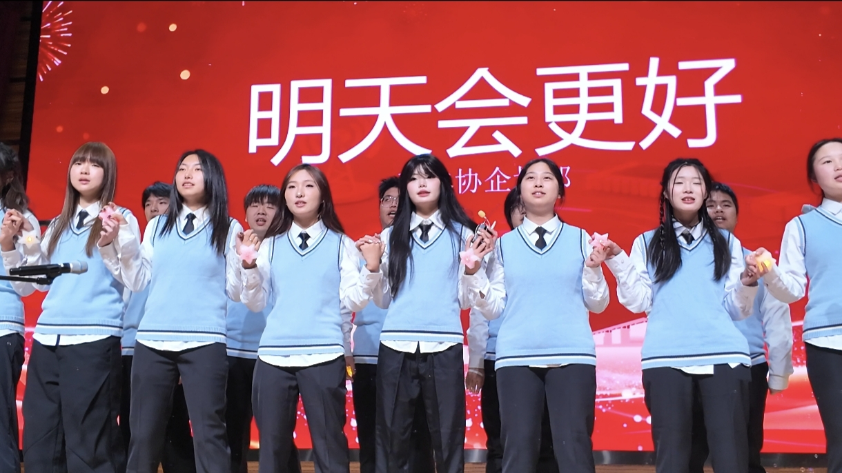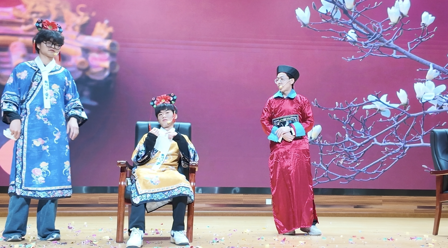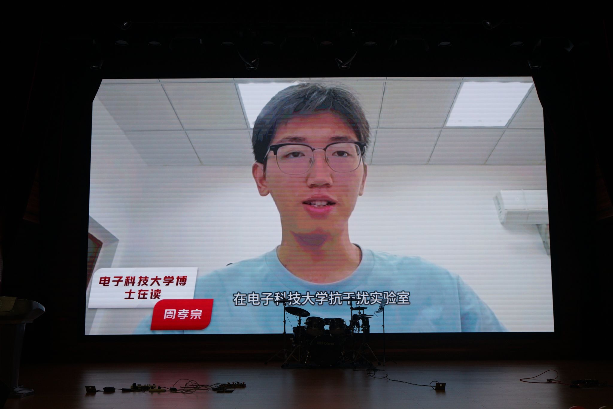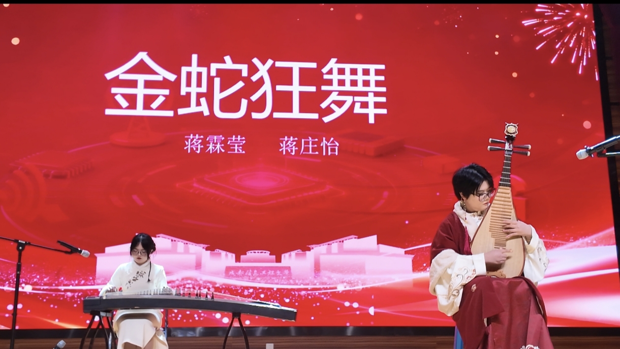 恢宏气势展望未来,凝聚铿锵奋进力量。杨旭、邓朦用《淋雨一直走》唱出遇困难不踌躇迎难而上的勇气;一曲古筝琵琶合奏《金蛇狂舞》,蒋霖莹、蒋庄怡同学带领现场欣赏中式美学的雅致;勇攀科创高峰,颁奖“学习之星、科创之星”给何曼曼、陈嫒媛、王钰卓、通信创新实验室。