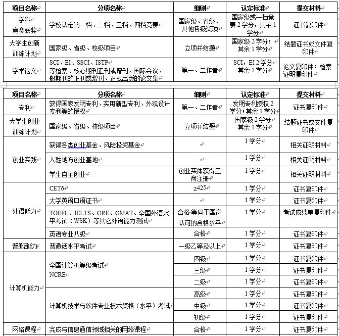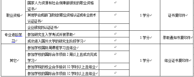 学生在本科学习期间须完成6个创新创业教育环节的学分,包括创新创业基础教育系列课程2学分、《创新、发明与知识产权实务实践项目》1学分和《创新创业实践》3学分。学生可通过下表所列项目获得《创新创业实践》学分。