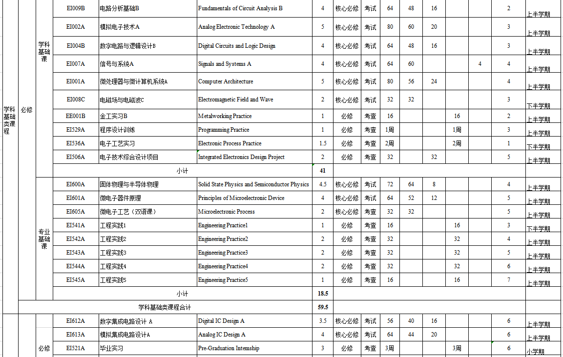 主要专业核心课程(11门):电路分析基础B、模拟电子技术A、数字电路与逻辑设计B、微处理器与微计算机系统A、电磁场与电磁波C、信号与系统A、固体物理与半导体物理、微电子器件原理、微电子工艺、数字集成电路设计A、模拟集成电路设计A。
