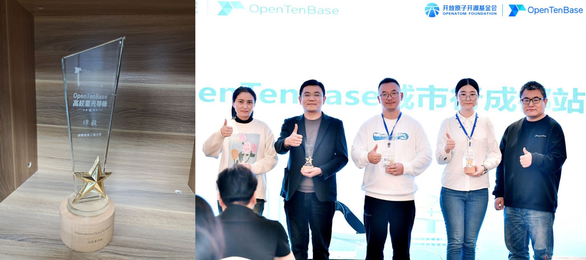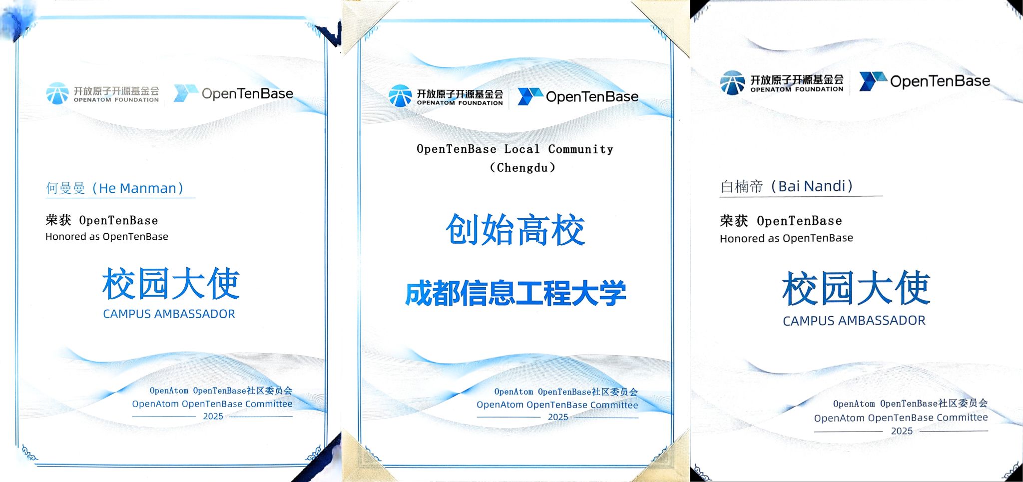 在本次活动的生态共建表彰环节,我校师生斩获多项荣誉:谭毅老师引领开源教学实践获授"OpenTenBase高校星光导师"称号;何曼曼、白楠帝两位同学因在开源事务及开源大赛等诸多方面的突出表现当选OpenTenBase校园大使。我校卓越的实践创新育人理念和工程科技人才培养模式与深度参与区域开源生态规划、培育开源人才的举措高度契合,被评为"OpenTenBase Local Community(Chengdu)创始高校"。