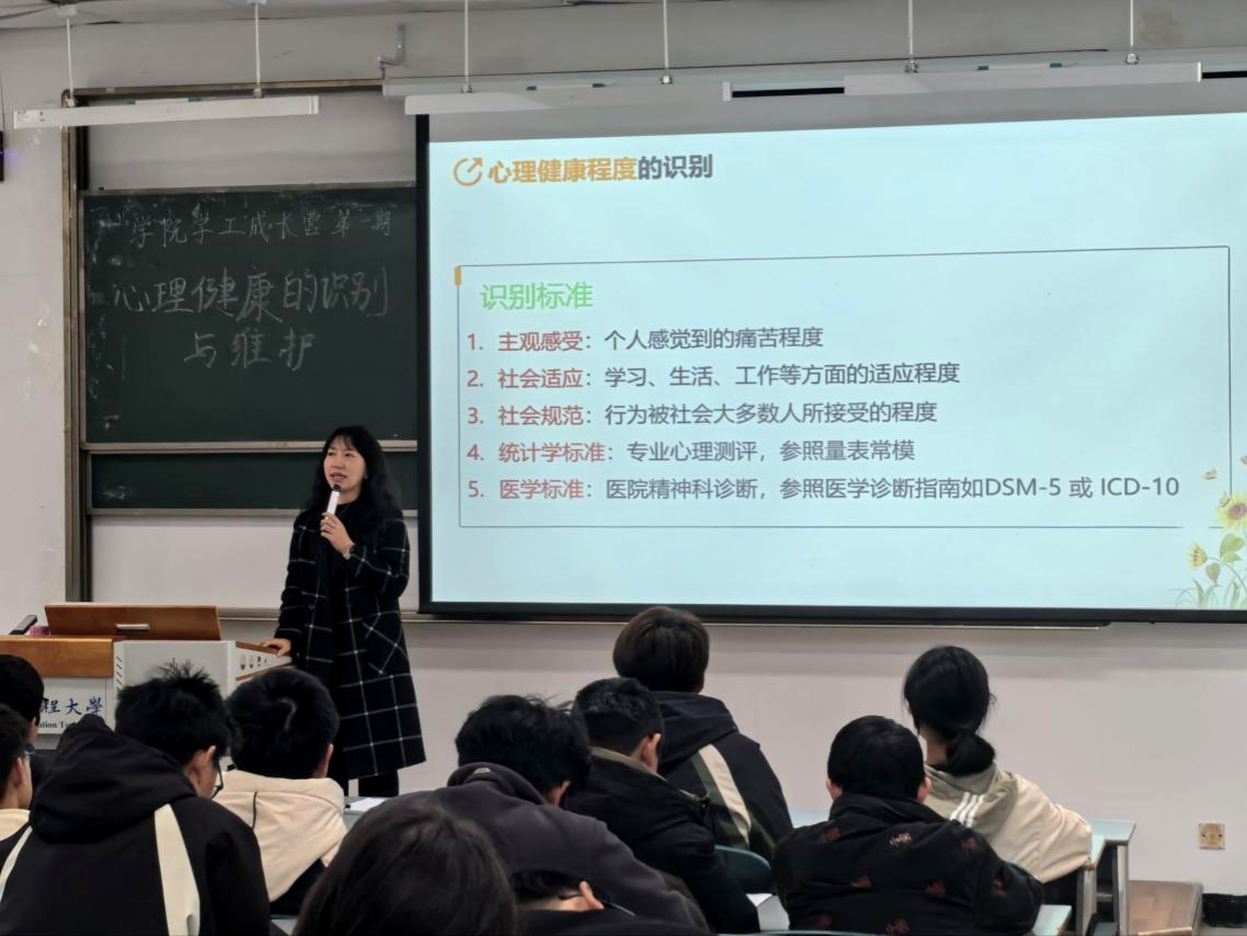 11月27日,在H4112教室举办了以“心理健康状态的识别与维护”为主题的心理健康讲座,邀请电子科技大学心理健康教育中心副主任张欣欣老师担任主讲。讲座围绕心理健康的内涵、识别方法与维护策略展开,结合大学生常见的学业、人际与适应压力,剖析心理困扰的表现,并强调了辅导员与心理委员在校园心理支持系统中的协同作用。现场氛围专注融洽,同学们纷纷表示对心理健康有了更科学的理解和关注。