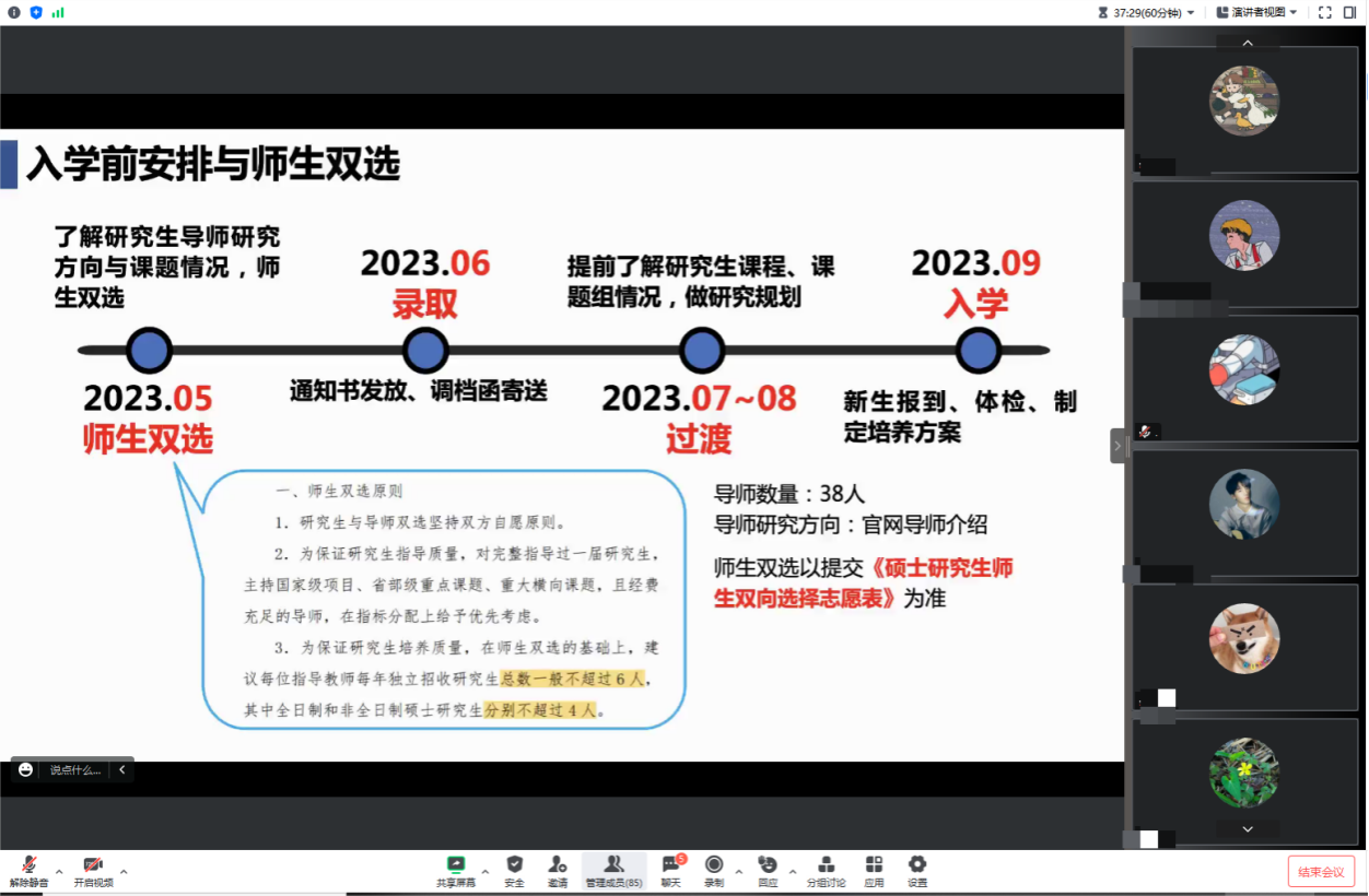 学院副院长介绍了2023年招生拟录取情况及专业研究方向、入学前安排与师生双选、新生安排及科技周活动等相关工作,鼓励学生及早调整学习状态,做好未来三年的学习和科研计划。院长强调学生应及早确定与硕士生导师的双选,以学习和科研为主。