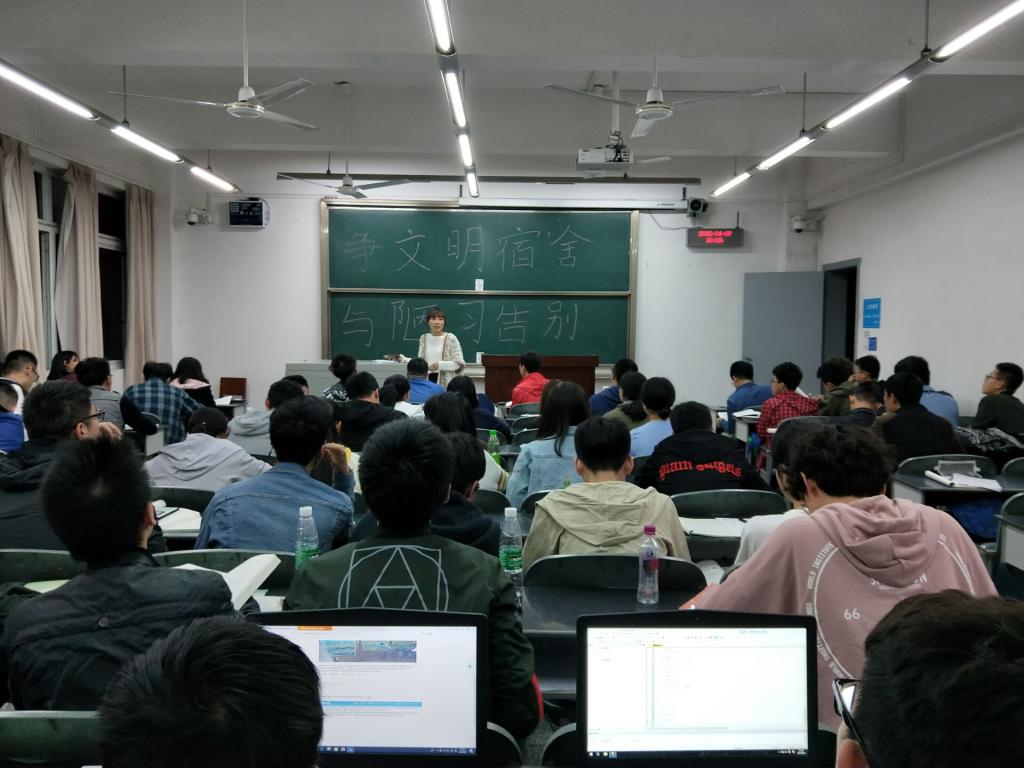 辅导员首先对各班返校情况进行了清查并再次强调了晚操晚自习的管理规定,严禁旷课及迟到早退。接着,将近期学校对宿舍卫生安全以及生活秩序的摸查情况进行了公布,并提出了需要即刻整改的四大问题。第一:严禁使用大功率电器,不得乱拉钱接电;第二:不得违规占用公共区域摆放和晾晒个人物品;第三:不得叫外卖,将外卖垃圾或生活垃圾放在楼道或宿舍门口,要及时倾倒在指定位置;第四:所有宿舍必须晚11:30熄灯,否则按照17记得管理规定予以相应处置;第五:宿舍内不养宠物,不聚众赌博、打牌。