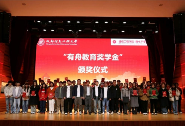 11月21日,“有舟教育奖学金”颁奖仪式在航空港校区大礼堂隆重举行。参与本次活动的有舟教育科技有限公司创始人王开博,创始人兼市场总监史达田,市场部经理马平超,有舟驾了么总经理、通信工程学院校友会秘书长汪祖国,有舟驾了么双流片区经理任磊,太阳集团tcy8722通信工程学院党委副书记刘畅,23级辅导员彭靖涵,以及2023级全体学生及2022级部分学生干部代表。