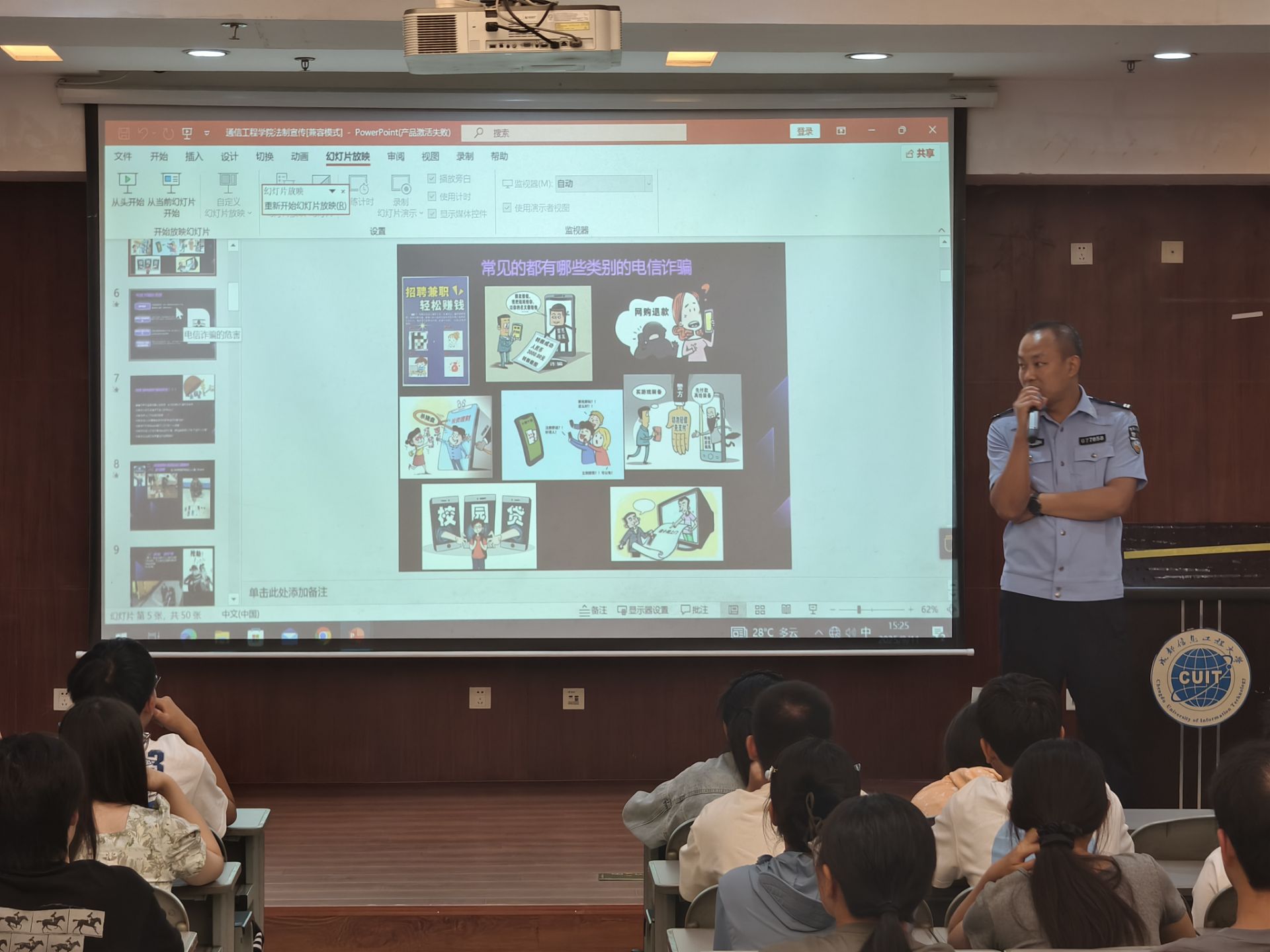 9月11日下午,机场路派出所民警雷军在学术报告厅为学院2025级全体新生开展了一场主题鲜明、内容丰富的“法制进校园”宣传教育讲座。此次活动旨在增强大学新生的法律意识和自我保护能力,帮助同学们系好大学生活的第一粒“法治扣子”。