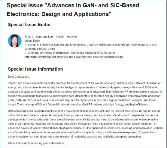 罗小蓉教授受邀担任“Micromachines”期刊的专刊“Advances in GaN- and SiC-Based Electronics: Design and Applications”编辑