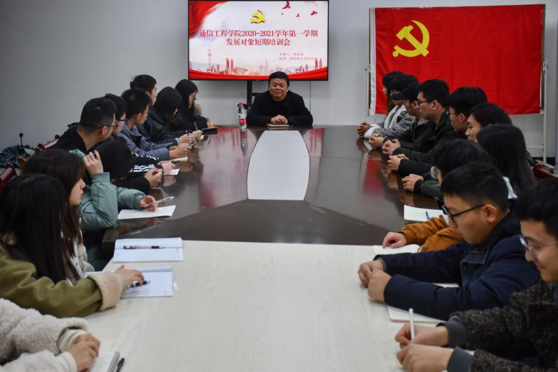 为贯彻落实《中国共产党发展党员工作细则》规定,2020年11月30日,通信工程学院学生党支部于双中心A603顺利开展2020-2021学年第一学期发展对象培训会。本次会议由通信工程学院党委书记刘绍全主讲,通信工程学院本批次全体发展对象参加此次培训。