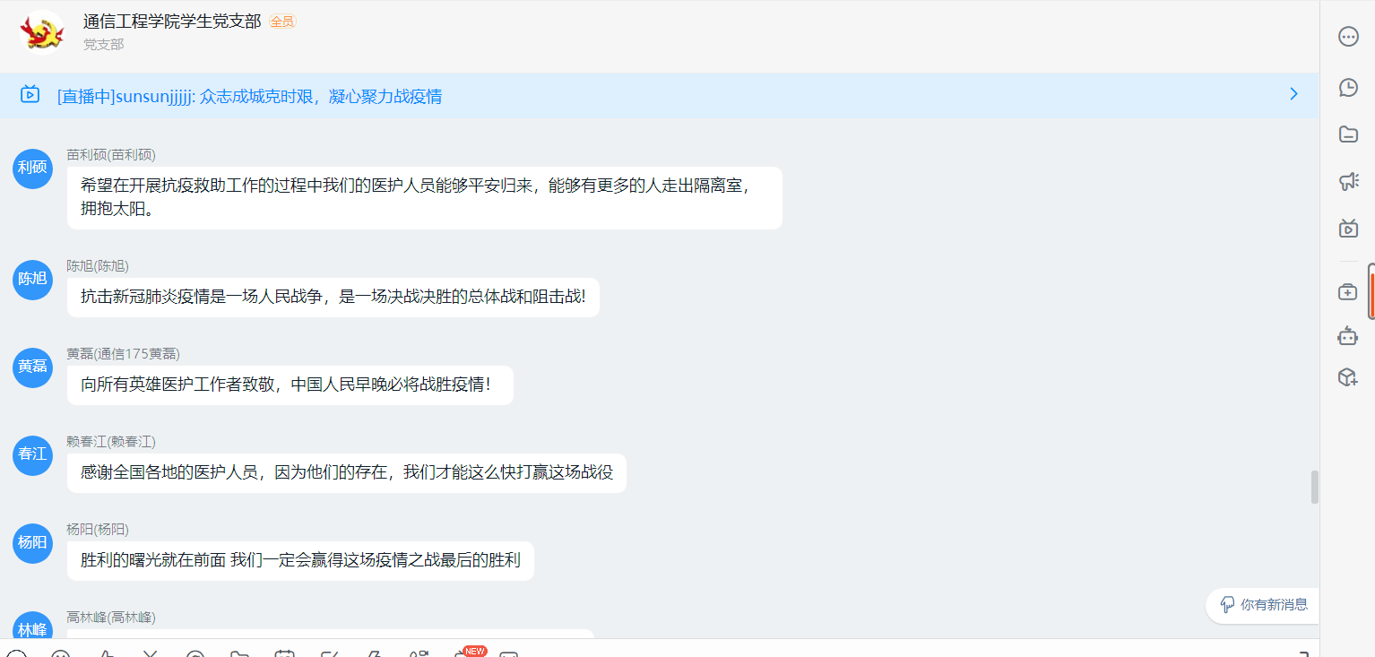 为响应习近平总书记在新冠肺炎疫情防控工作部署会议上的讲话,发挥疫情防控中党支部战斗堡垒作用,通信工程学院学生党支部“众志成城克时艰,凝心聚力战役情”线上活动于3月25日20:00圆满开展,通信工程学院学生党支部全体党员参与此次活动。