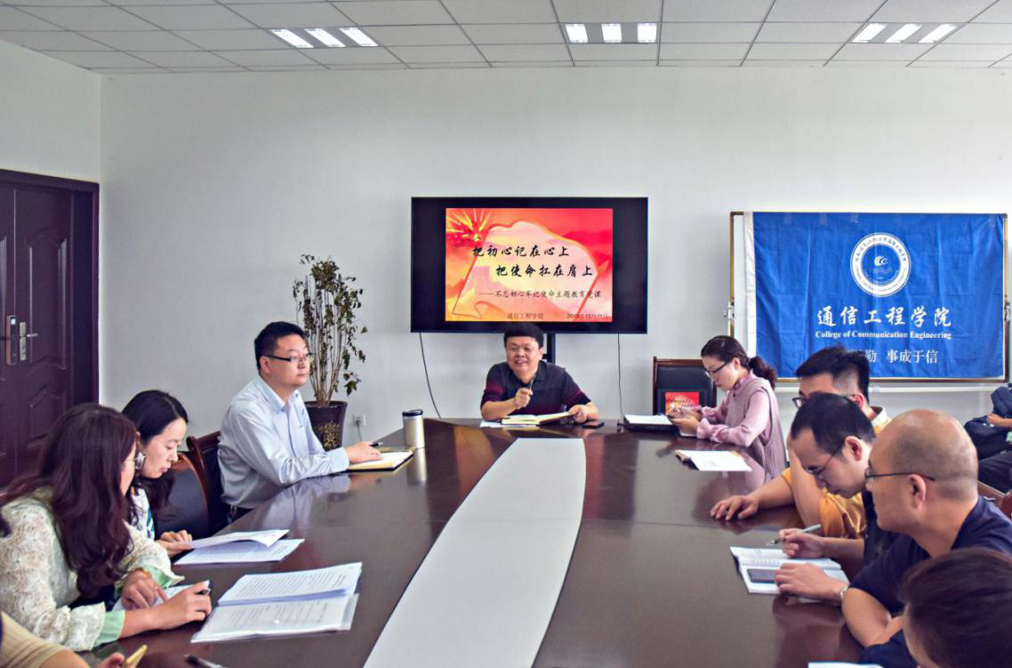 在会议中,通信工程学院党总支书记刘绍全说:“新中国成立前,无数革命先烈为了国家的富强,人民的幸福、民族的解放,在硝烟弥漫的战场上,抛头颅、洒热血、为建设新中国而英勇战斗,支撑着他们的是共产主义的信念。今天,身为新时代的共产党员,我们同样应该坚持共产主义信念,为人民谋幸福、为民族谋复兴。”他强调通信工程学院党委要以行政党支部和学生党支部为主体,以立体思想工作者为奋斗目标,提升“硬本领”、“软实力”,建立科学理念,要求师生党员在政治上有高度,坚持正确的方向引领学生;在思想上有深度启迪学生;在观念上保持鲜度,用与时俱进的观念去引导学生;在心理上始终保持热度,将心血奉献给通信工程学院学子。