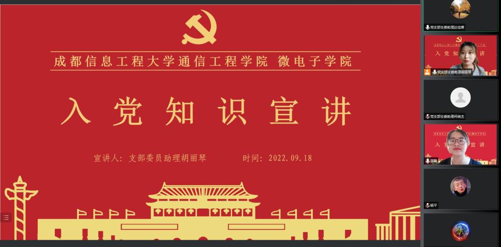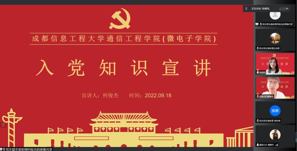 为帮助2022级新同学了解入党知识、熟悉入党流程,提高对党的认知。通信工程学院学生党支部于9月18日以线上会议形式顺利开展了2022年新生入党知识宣讲会。通信工程学院学生党支部全体成员,邵璐老师,张晓凤老师及2022级全体新生参加。